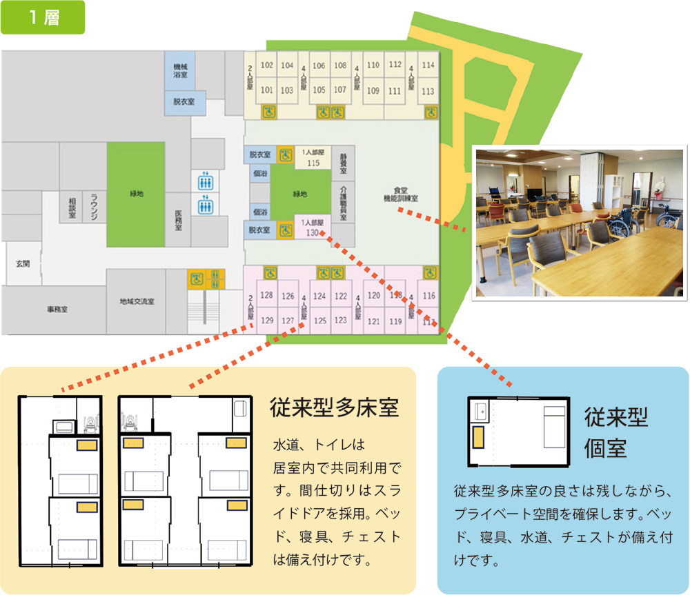 1層は多床室が中心。多床室とは、2~4名1室でご生活をしていただく形態。一人で過ごす時間が少ない為、寂しさを感じることが少なくなります。