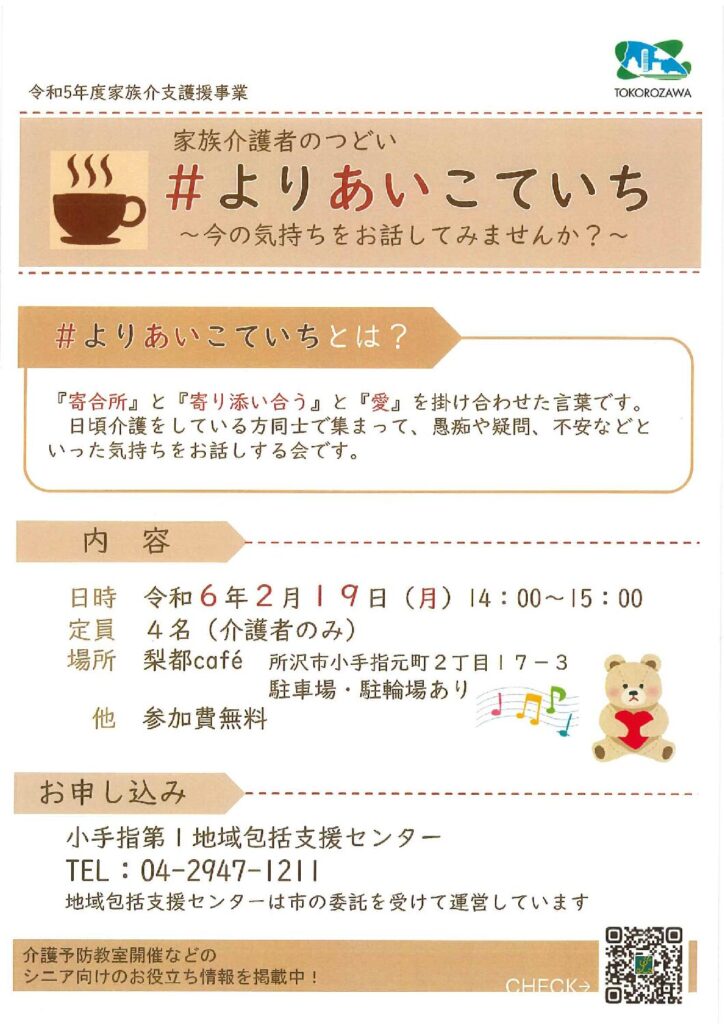 2024年2月20日 小手指 第1 【報告】家族介護者の集い『#よりあい こていち』無事に終了しました! 令和5年度家族介護支援事業 日時:令和6年2月19日(月)14:00~15:00 場所:梨都ⅽafé 参加して下さった皆様、 ご協力いただいた「梨都ⅽafé」様 ありがとうございました! 投稿者について 小手指 第1