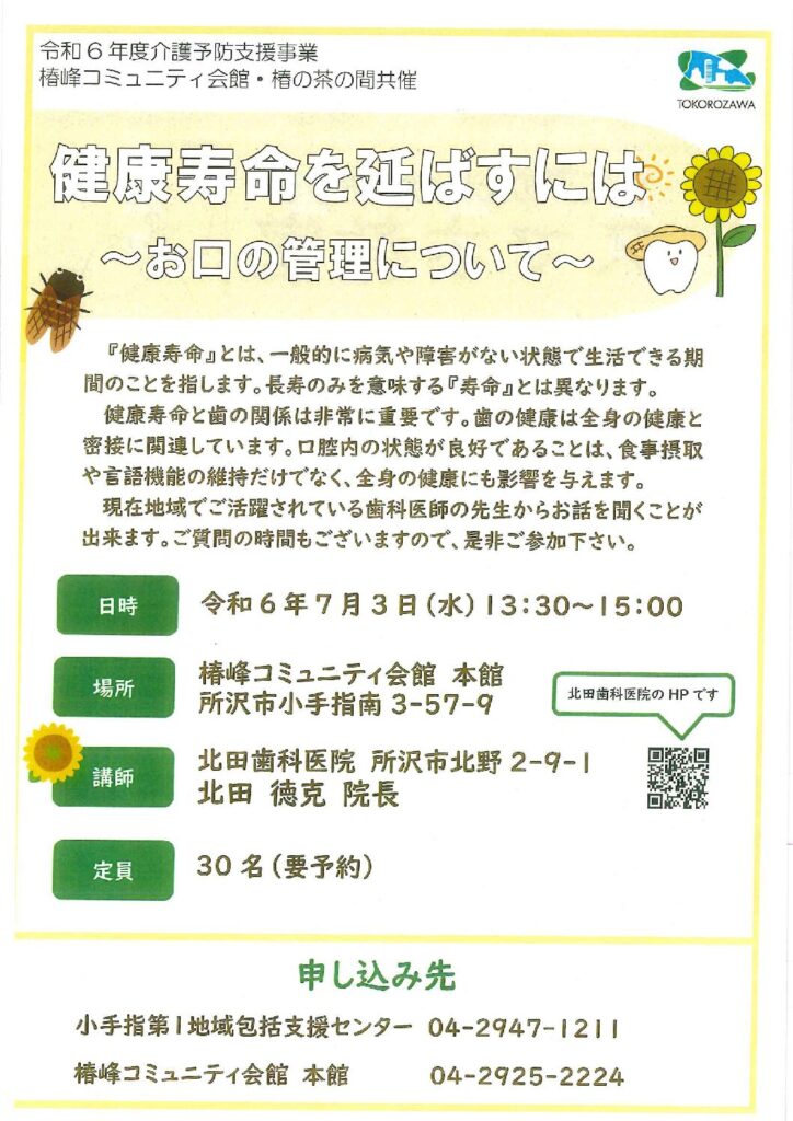 2024年7月3日 小手指 第1 【報告】『健康寿命を延ばすには~お口の管理について~』無事に終了いたしました! 令和6年度 介護予防支援事業〇日時:令和6年7月3日(水)13時30分~15時00分〇会場:椿峰コミュニティ会館 本館〇講師:北田歯科医院 北田 徳克 院長 参加して下さった皆様、北田先生 ありがとうございました! 投稿者について 小手指 第1